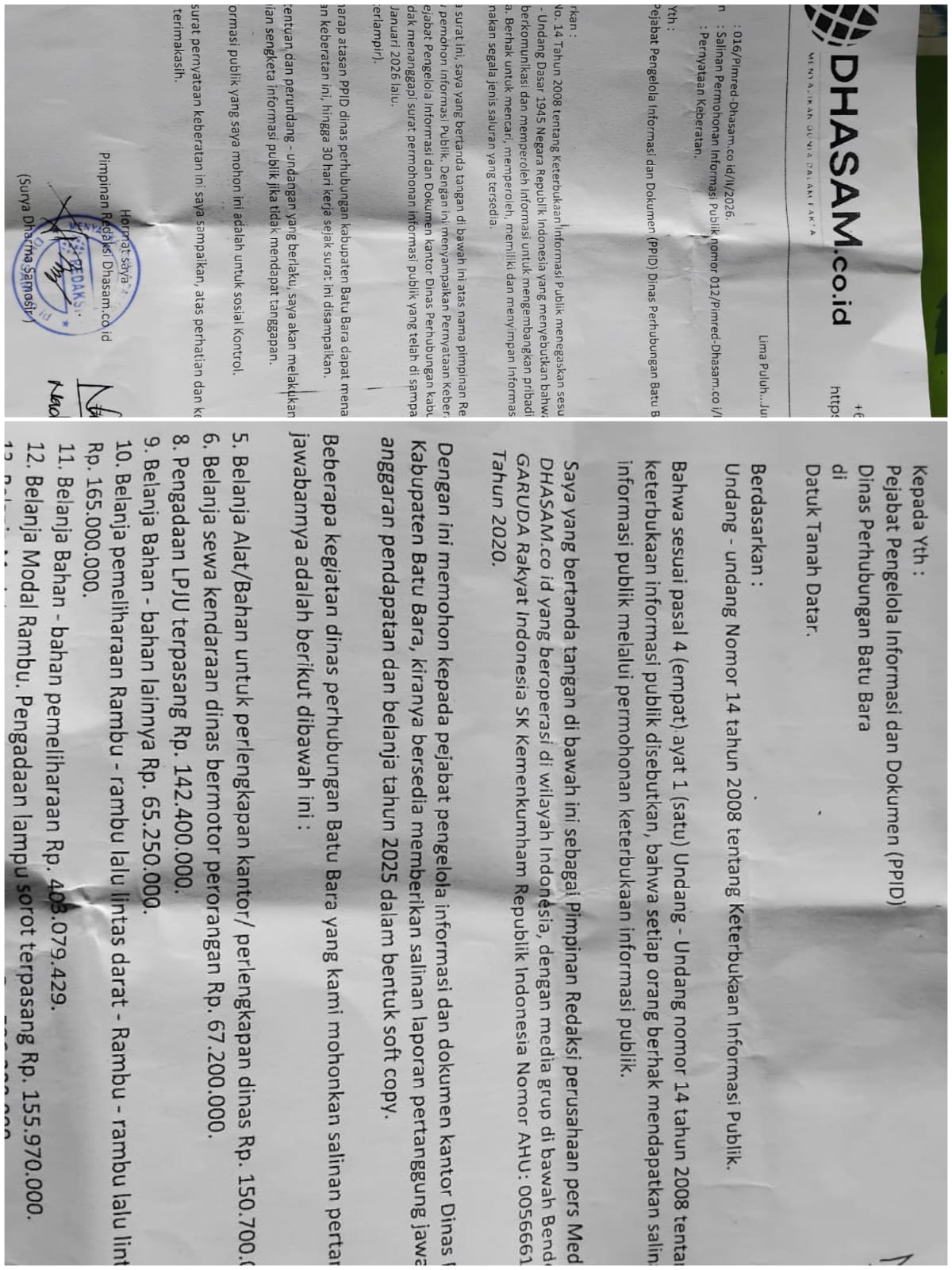 Permohonan informasi itu diajukan secara resmi oleh Pimpinan Redaksi Dhasam.co.id, Surya Dharma Samosir, melalui surat bernomor 012/Pimred-Dhasam.co.id/I/2026 yang ditujukan kepada Pejabat Pengelola Informasi dan Dokumentasi (PPID) di lingkungan Dinas Perhubungan Kabupaten Batu Bara.