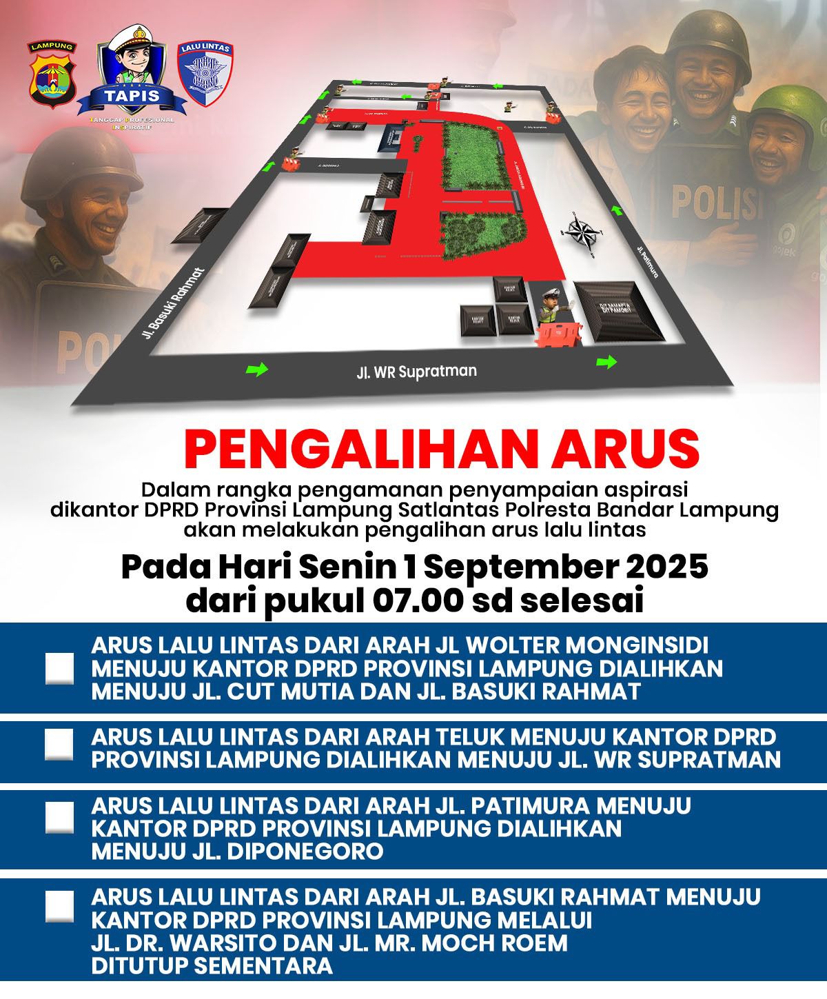 Satuan Lalu Lintas (Satlantas) Polresta Bandar Lampung akan memberlakukan pengalihan arus lalu lintas pada Senin (1/9/2025) mulai pukul 07.00 WIB hingga selesai. Langkah ini dilakukan untuk mendukung kelancaran dan keamanan penyampaian aspirasi di Kantor DPRD Provinsi Lampung.