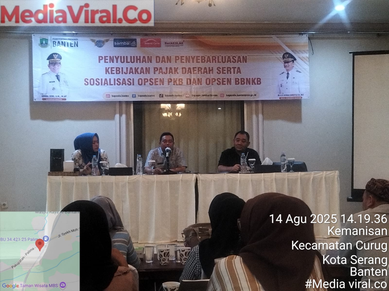 Dalam upaya meningkatkan kesadaran masyarakat akan pentingnya kepatuhan membayar pajak kendaraan, Badan Pendapatan Daerah (Bapenda) Provinsi Banten menggelar Sosialisasi dan Penyuluhan Kebijakan Pajak Daerah, termasuk sosialisasi opsen Pajak Kendaraan Bermotor (PKB) dan Bea Balik Nama Kendaraan Bermotor (BBNKB). Kegiatan ini berlangsung di Aula Wanda Galuh, Serang, Kamis (14/8/2025).