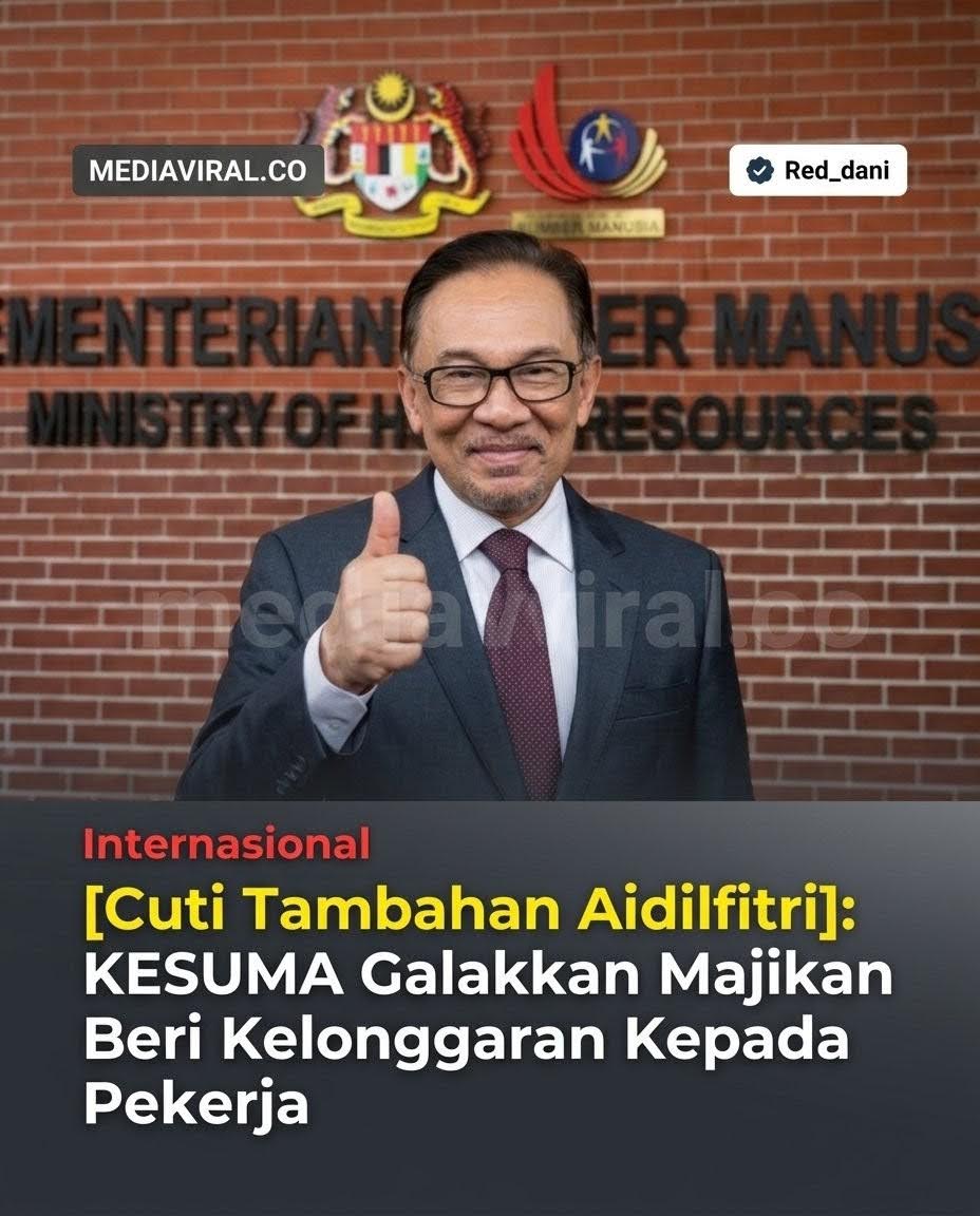 Kebijakan ini muncul setelah Perdana Menteri Anwar Ibrahim secara resmi menyetujui satu hari cuti tambahan nasional, sebuah keputusan yang langsung disambut antusias para pekerja yang berharap bisa lebih lama berkumpul bersama keluarga.