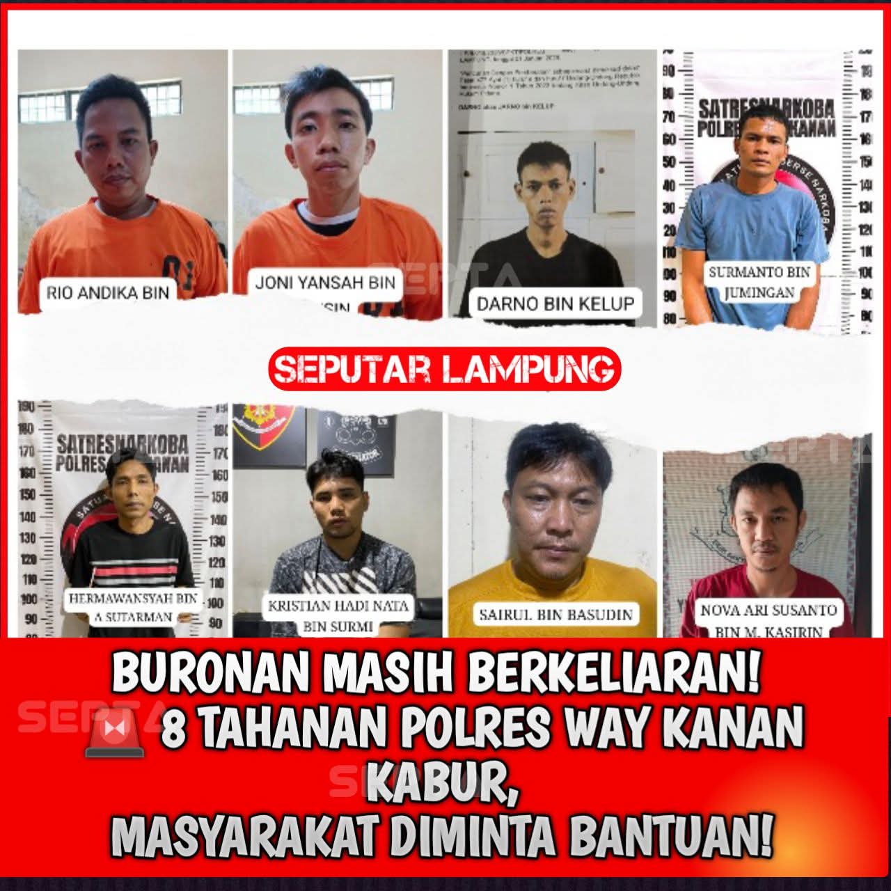 Delapan tahanan yang melarikan diri dari sel tahanan Polres Way Kanan masih dalam pengejaran aparat. Hingga Senin (23/2), tim gabungan dari Polda Lampung terus melakukan penyisiran intensif, termasuk hingga wilayah perbatasan Lampung dan Sumatera Selatan.