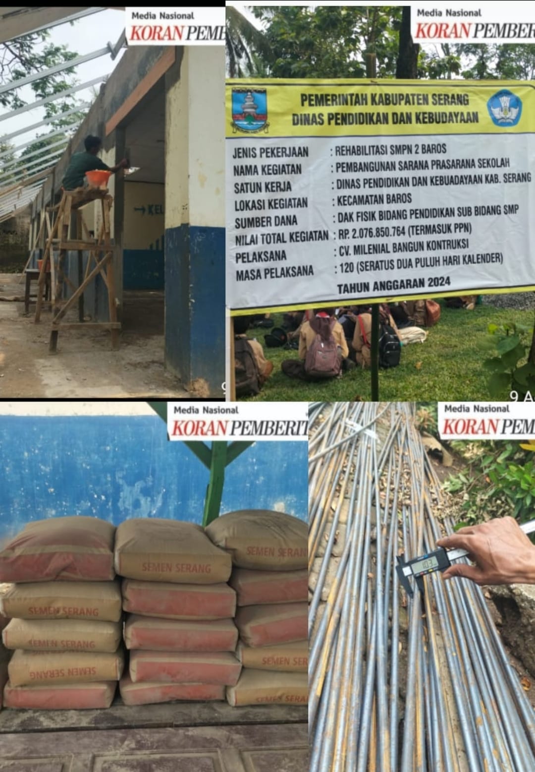 Saat awak media meninjau kelokasi Pembangunan Rehabilitasi prasarana Ruang Sekolah SMPN 2 Baros terpantau untuk material besi tidak sesuai spek ,material Semen menggunakan Semen Serang,, bahkan untuk sebagian para pekerja tidak dilengkapi APD dan di Papan Informasi Publik tidak tercantum untuk siapa atau CV/PT apa Consultan pengawasnya.