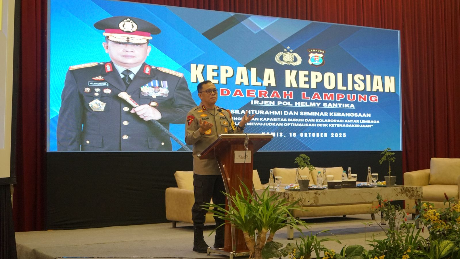 Apresiasi tersebut disampaikan Kapolda saat menghadiri Silaturahmi dan Seminar Kebangsaan yang digelar oleh Perserikatan Buruh Provinsi Lampung di Hotel Horison Bandar Lampung, Kamis (16/10/2025).