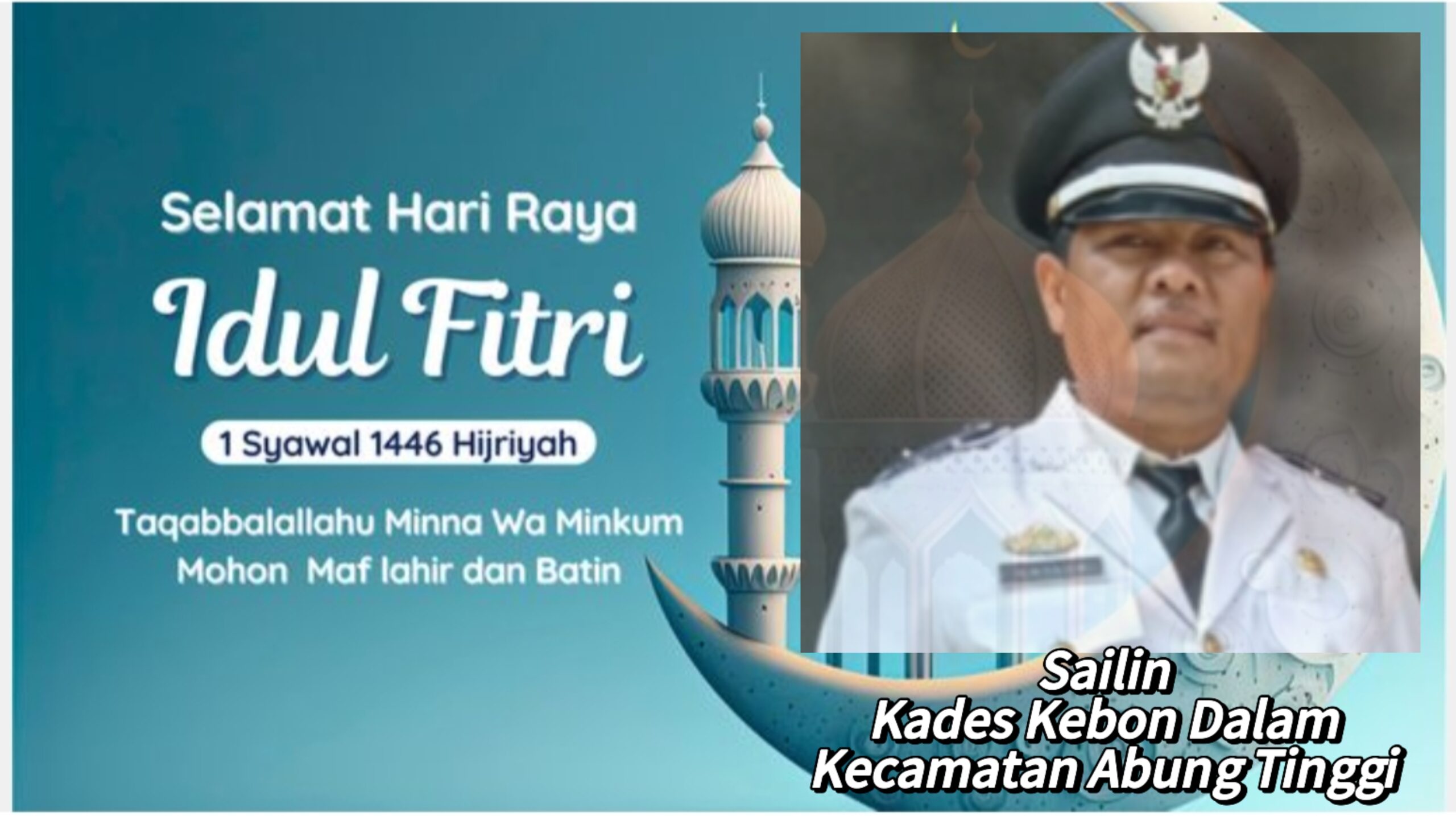 Kepala Desa Kebon Dalam Kecamatan Abung Tinggi Kabupaten Lampung Utara Sailin mengucapkan, Selamat Haru Raya Idul Fitri 1446 Hijriah bagi umat muslim di Indonesia, hari Raya Idul Fitri adalah hari yang dinanti-nantikan dan dirindukan dan hari kemenangan bagi umat muslim.