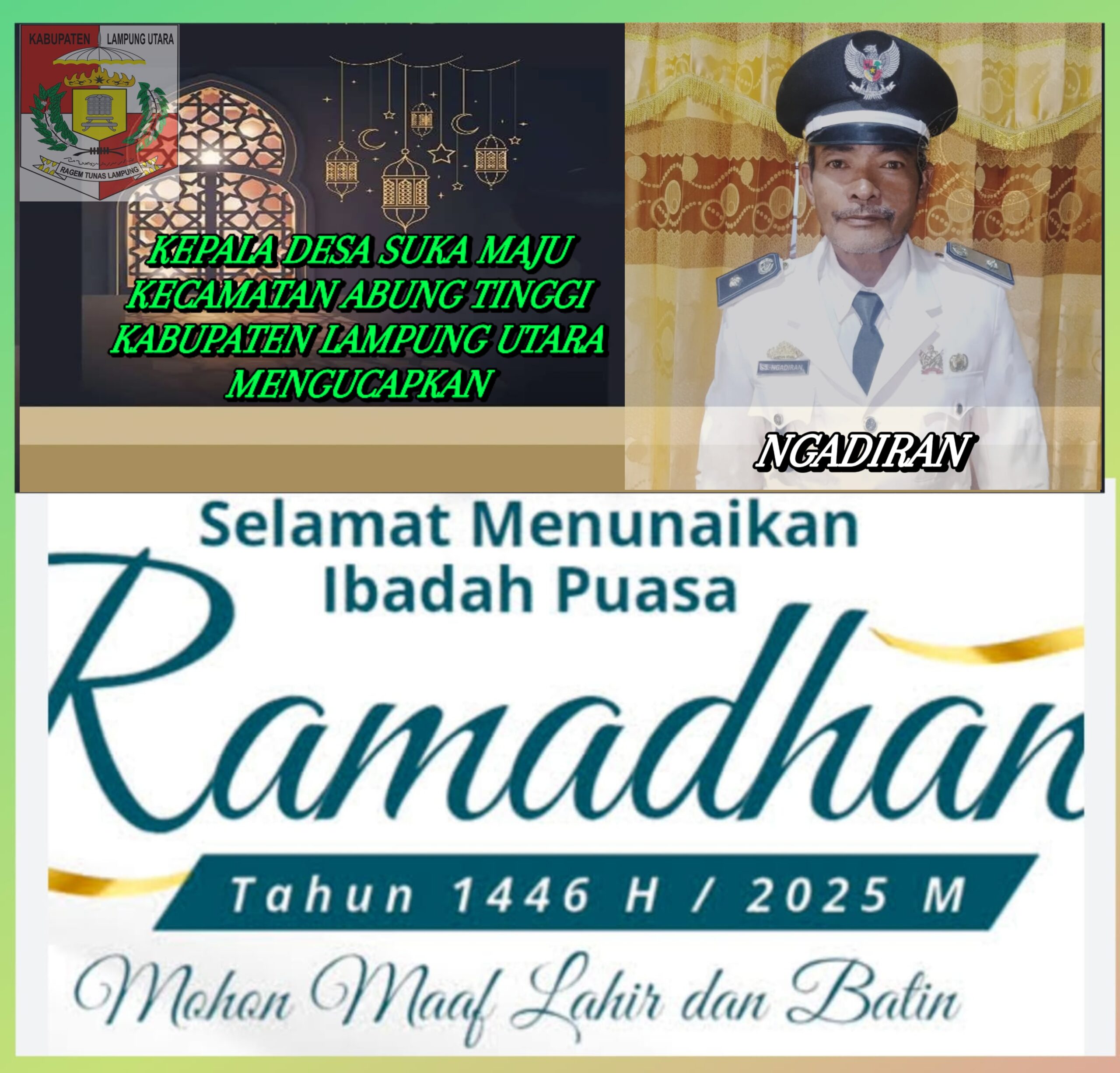 Kepala Desa Sukamaju Kecamatan Abung Tinggi Kabupaten Lampung Utara Ngadiran mengucapkan, Selamat Menjalankan Ibadah puasa di bulan suci Ramadhan 1446 Hijriah bagi umat muslim di Indonesia, bulan suci Ramadhan adalah momentum yang dinanti-nantikan dan dirindukan.