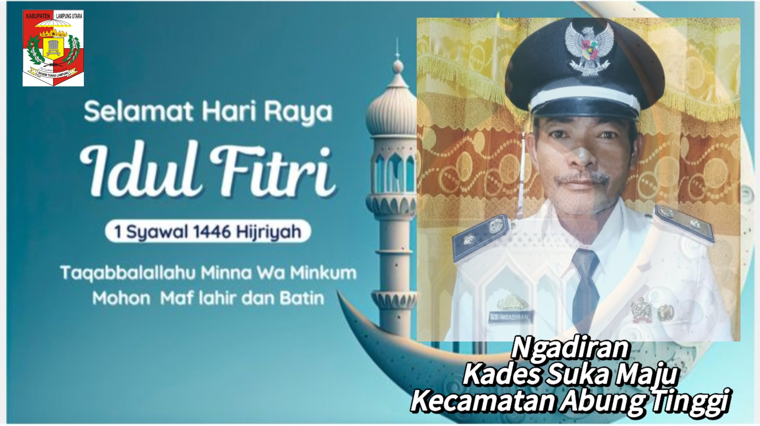 Kepala Desa Suka Maju Kecamatan Abung Tinggi Kabupaten Lampung Utara Ngadiran mengucapkan, Selamat Haru Raya Idul Fitri 1446 Hijriah bagi umat muslim di Indonesia, hari Raya Idul Fitri adalah hari yang dinanti-nantikan dan dirindukan dan hari kemenangan bagi umat muslim.