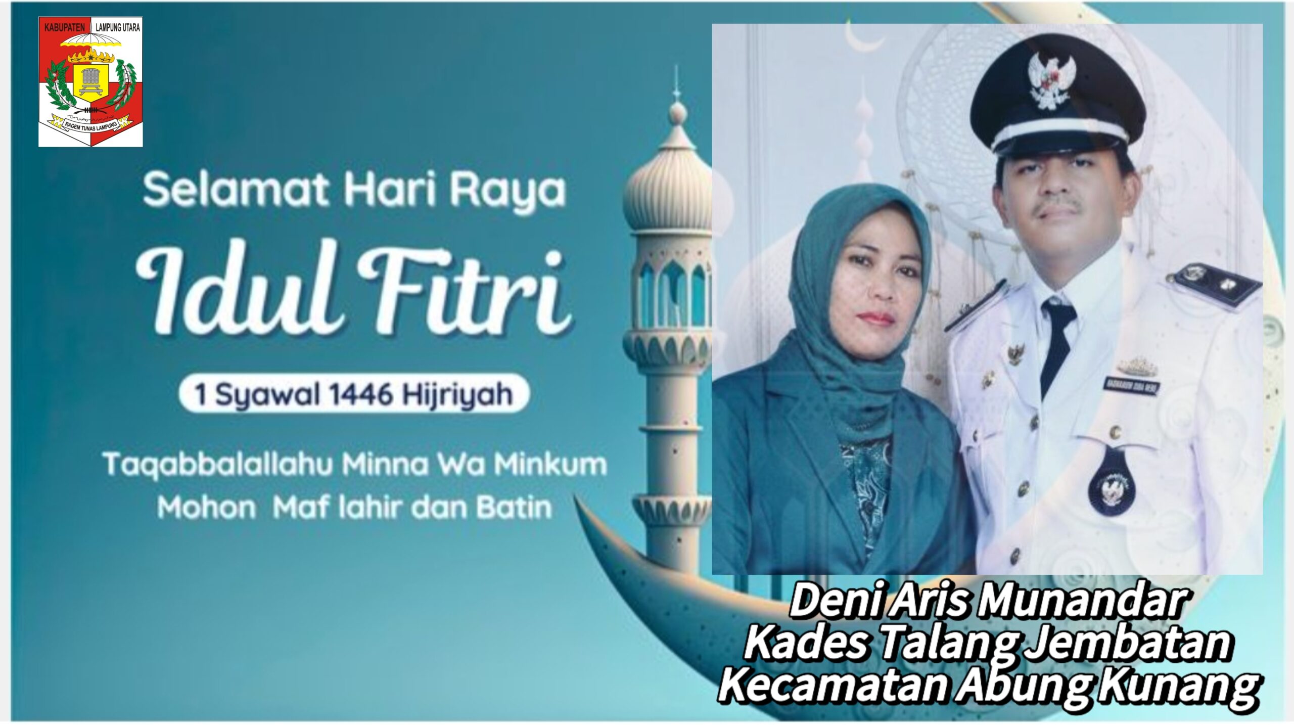 Kepala Desa Talang Jembatan Kecamatan Abung Kunang Kabupaten Lampung Utara Deni Aris Munandar mengucapkan, Selamat Haru Raya Idul Fitri 1446 Hijriah bagi umat muslim di Indonesia, hari Raya Idul Fitri adalah hari yang dinanti-nantikan dan dirindukan dan hari kemenangan bagi umat muslim.