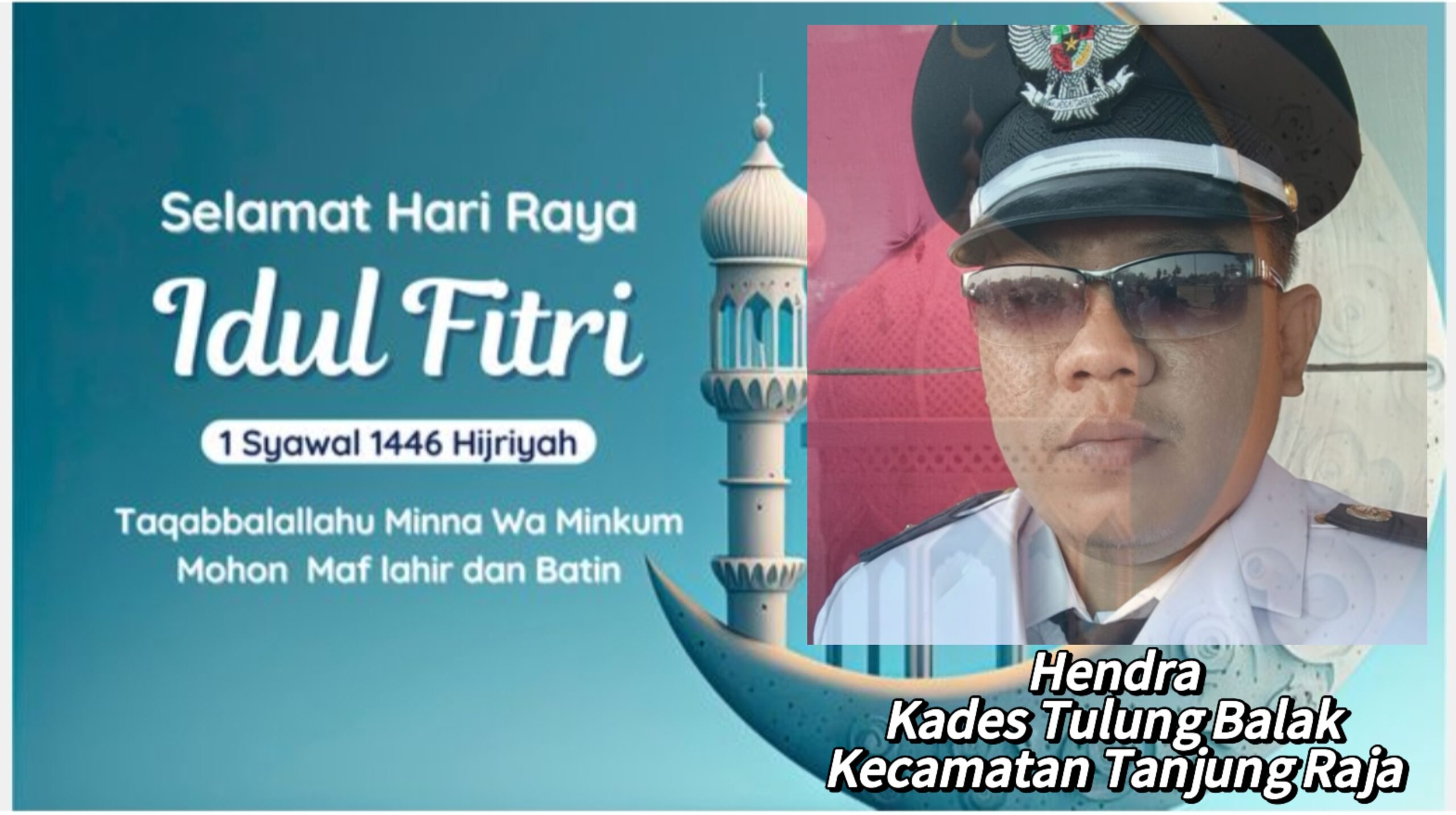 Kepala Desa Tulung Balak Kecamatan Tanjung Raja Kabupaten Lampung Utara Hendra mengucapkan, Selamat Hari Raya Idul Fitri 1446 Hijriah bagi umat muslim di Indonesia, hari Raya Idul Fitri adalah hari yang dinanti-nantikan dan dirindukan dan hari kemenangan bagi umat muslim.