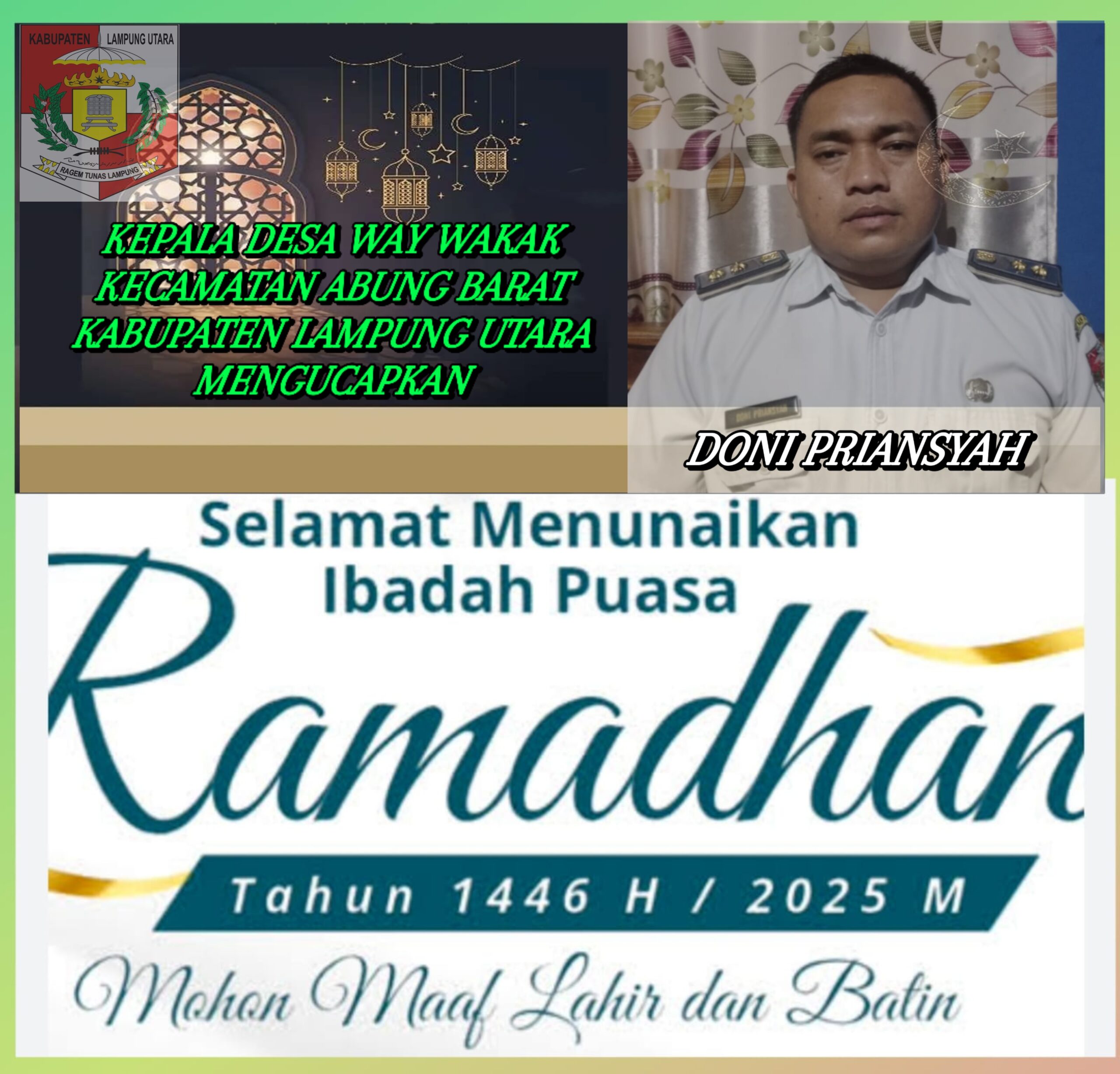 Kepala Desa Way Wakak Kecamatan Abung Barat Doni Priansyah mengucapkan, Selamat Menjalankan Ibadah puasa di bulan suci Ramadhan 1446 Hijriah bagi umat muslim di Indonesia, bulan suci Ramadhan adalah momentum yang dinanti-nantikan dan dirindukan.