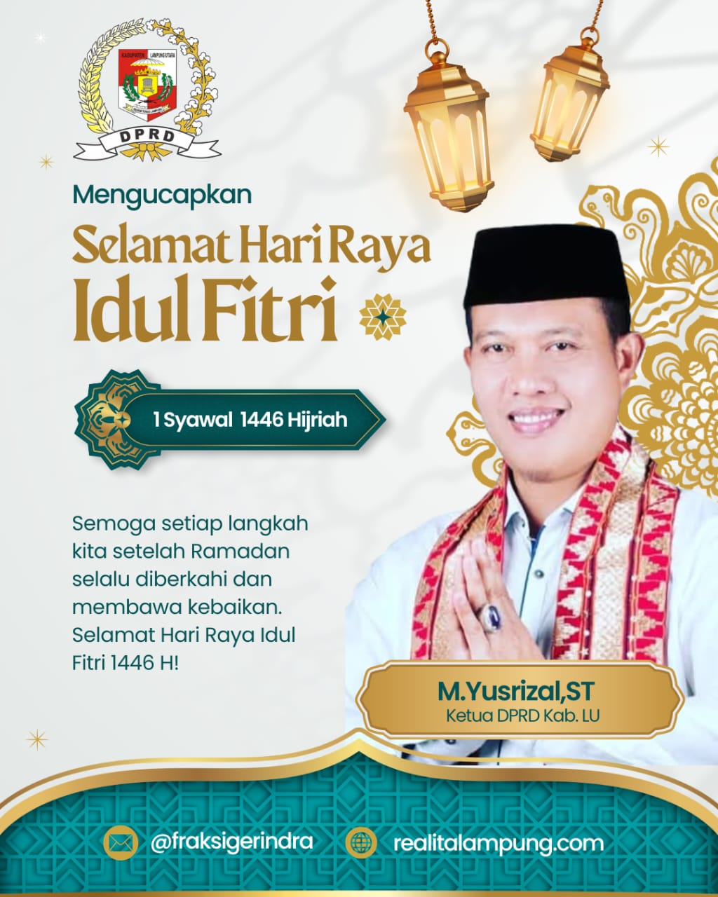 Ketua DPRD Kabupaten Lampung Utara M.Yusrizal.,S.T mengucapkan, Selamat Hari Raya Idul Fitri 1446 Hijriah bagi umat muslim di Indonesia, hari Raya Idul Fitri adalah hari yang dinanti-nantikan dan dirindukan dan hari kemenangan bagi umat muslim.