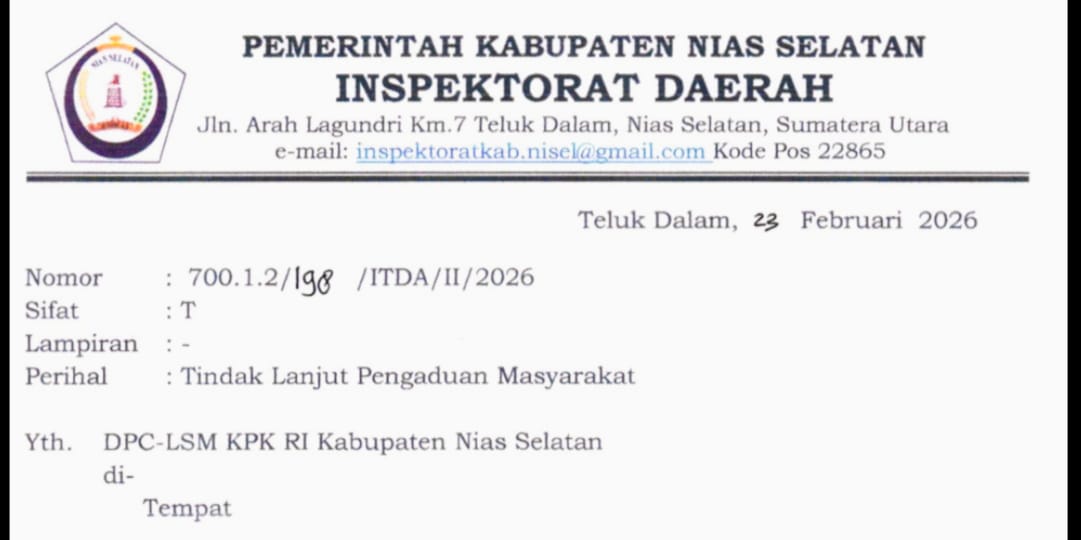 Jawaban akhirnya datang melalui surat resmi Inspektorat Daerah Kabupaten Nias Selatan tertanggal 23 Februari 2026 dengan nomor 700.1.2/198/ITDA/II/2026 yang menyatakan bahwa laporan tersebut sedang dalam tahap telaah dan verifikasi.