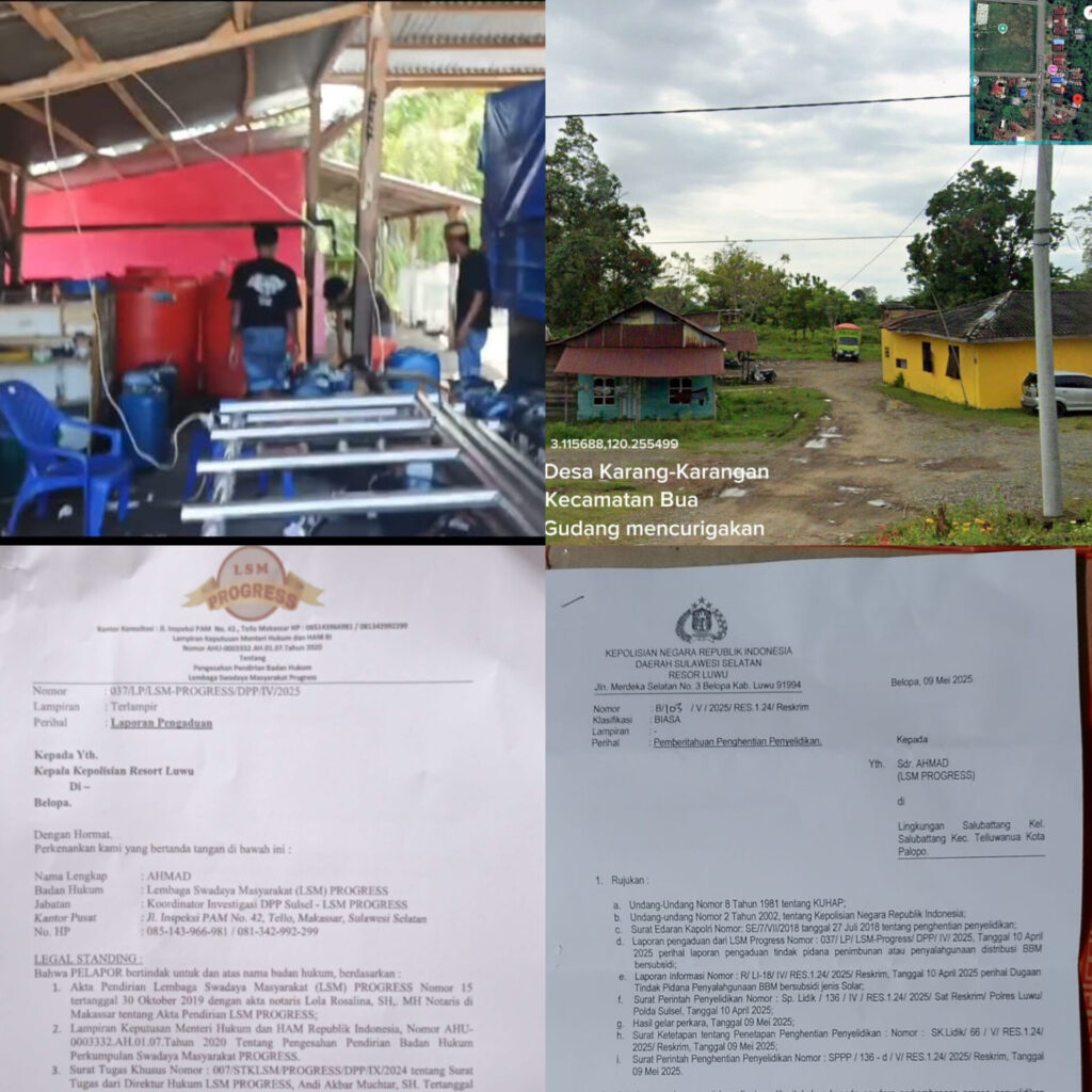 Keputusan kepolisian untuk menghentikan penyelidikan atas dugaan penampungan ilegal BBM Solar subsidi di Desa Karang-Karangan, Kecamatan Bua, Kabupaten Luwu, menuai reaksi keras dari LSM Progress.