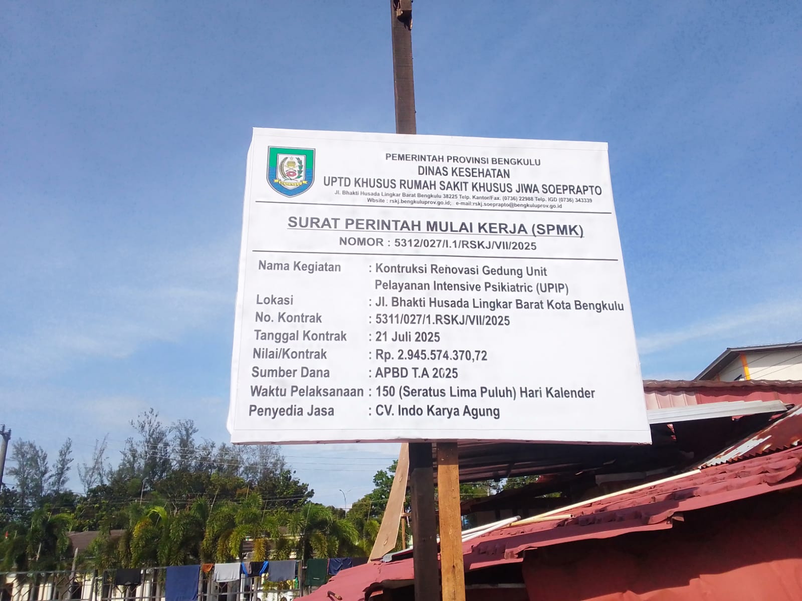15/8/2025. Peroyek pekerjaan renovasi gedung Unit Pelayanan Intensive Psikistric (UPIP) Rumah Sakit Jiwa Kota Bengkulu yang bersumber dari dana APBD tahun 2025 yang di kerjakan oleh CV. INDO KARYA AGUNG dengan nilai anggaran Rp.2.945.574370.72 dengan masa waktu pelaksanaan 150 hari kerja, diduga lalainya dari pengawasan serta melanggar UU K3.