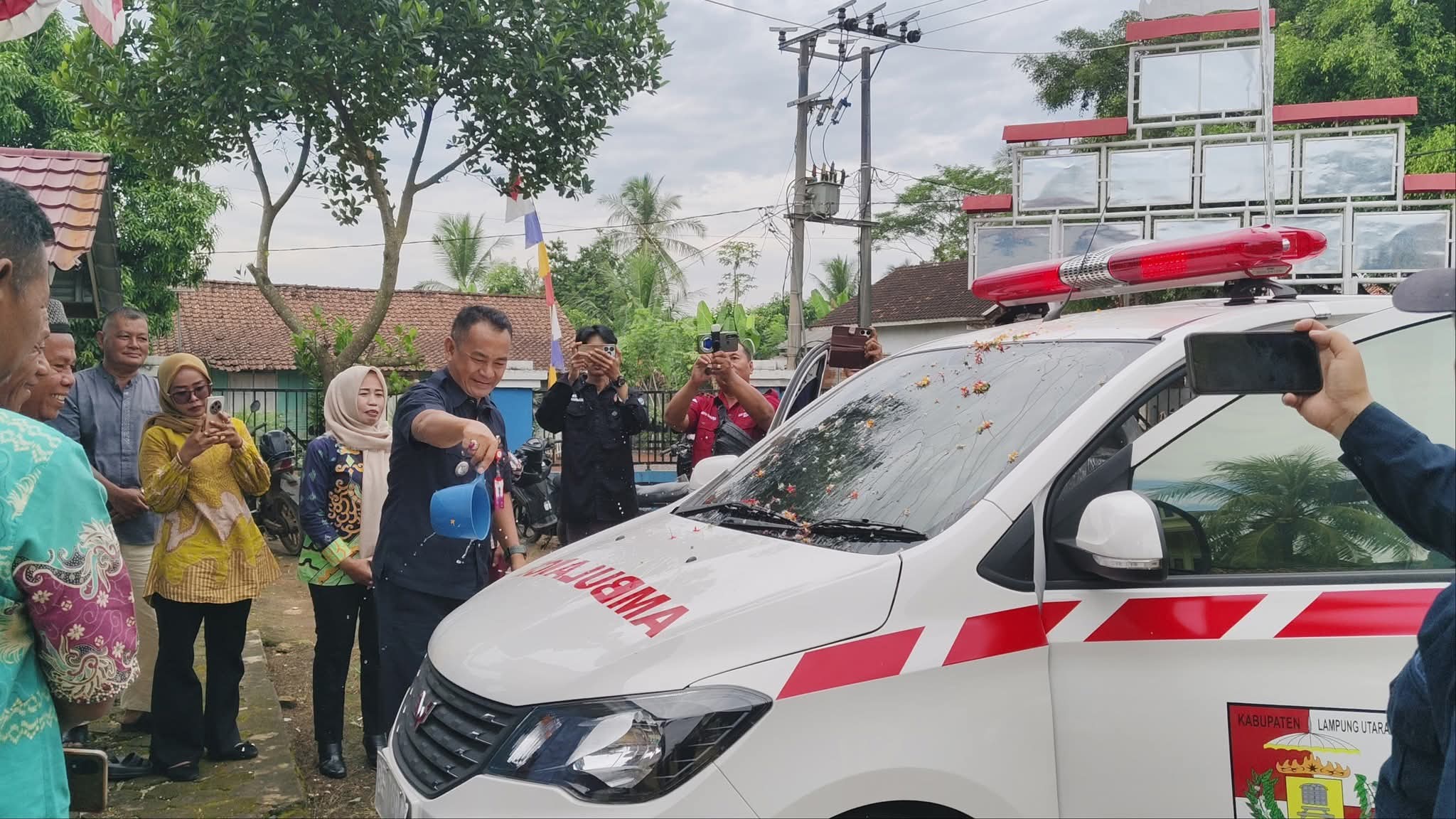 Penjabat Kepala Desa Kinciran sekaligus Camat Abung Tengah Kasim, S.E.,M.M. Realisasikan Belanja Kendaraan Roda Empat berupa Ambulance melalui Dana Desa Tahun 2025, di Halaman Kantor Desa Kamis 3 Juli 2025.