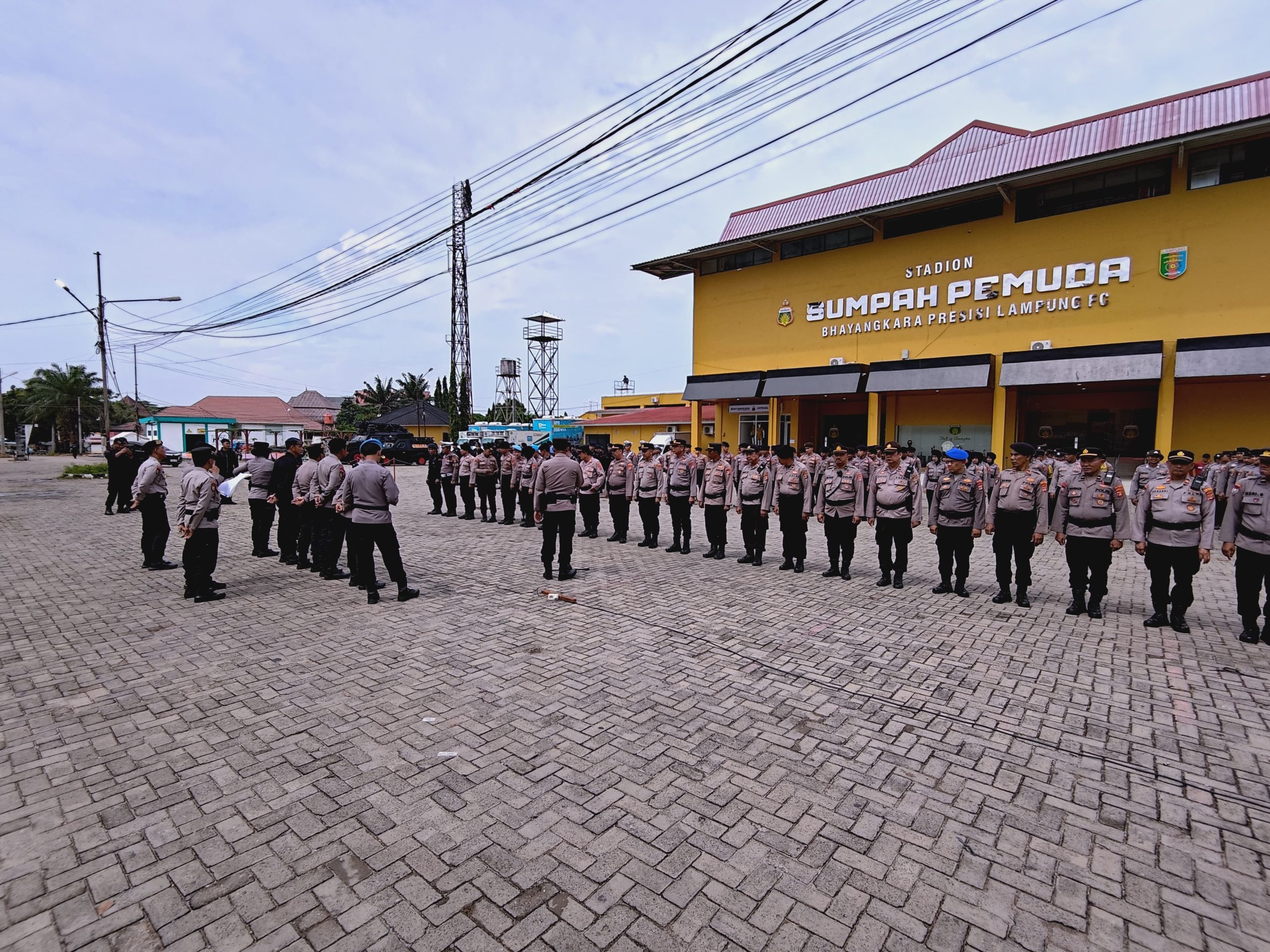 Personel gabungan Polda Lampung melaksanakan pengamanan dalam pertandingan lanjutan antara Bhayangkara Presisi Lampung FC melawan Persik Kediri yang digelar di Stadion Sumpah Pemuda, Bandar Lampung. Jumat(19/9/25)