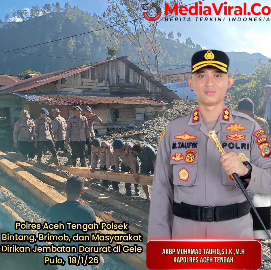Kepedulian dan semangat kebersamaan kembali ditunjukkan jajaran Polres Aceh Tengah. Personel Polsek Bintang bersama Personel Bawah Kendali Operasi (BKO) Brimob Polda Aceh, didukung aparatur kampung dan masyarakat, melaksanakan bakti sosial gotong royong pembangunan jembatan darurat di Kampung Gele Pulo, Kecamatan Bintang, Kabupaten Aceh Tengah, Minggu (18/1/2026).