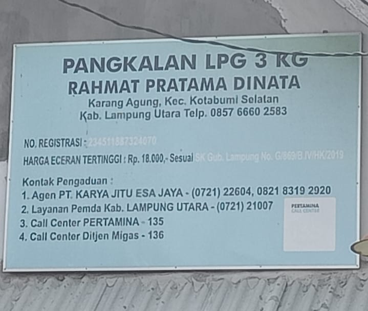 Dimohon kepada pihak penegak hukum polres lampung utara dan penyalur GAS LPG yaitu : PT KARYA JITU ESA JAYA untuk dapat menghentikan pengiriman kepada Pangkalan Bpk. Rahmad Pratama Dinata tersebut yang berada di Desa Karang Agung. (koranpemberitaankorupsi.id)