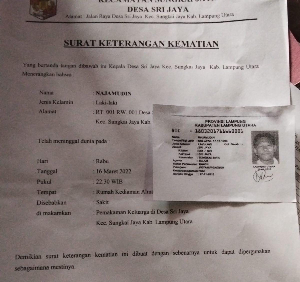 Menurut penjelasan Ariyanto, almarhum Najamudin pernah mengajukan pinjaman ke BRI Kupedes Kotabumi Sentral pada 3 Juni 2015 sebesar Rp40 juta. Namun beberapa tahun kemudian, kondisi kesehatan Najamudin memburuk akibat sakit menahun.