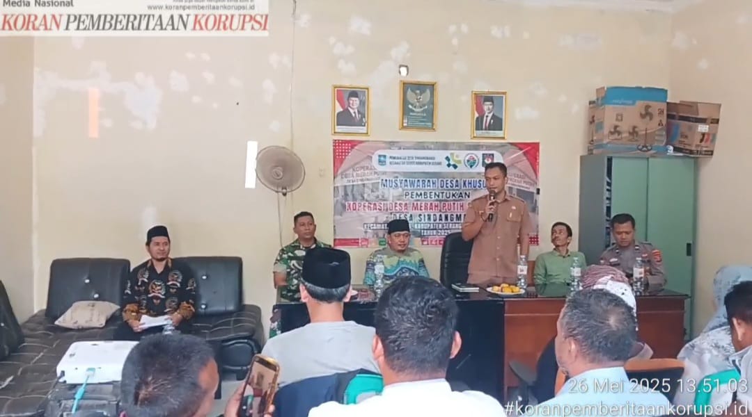 Pemerintah Desa Sinangmandi, Kecamatan Baros, Kabupaten Serang, Banten, menggelar (MUSDESUS) Musyawarah Desa Khusus Pembentukan Koperasi Merah Putih,, di Aula kantor Desa, yang di Hadiri lembaga Perkoperasian Provinsi Banten Sahroni, Ketua BPD dan anggota, RT/RW, Pendamping Desa, Babinsa, Babinkamtibmas, Tokoh masyarakat/Pemuda, kader PKK dan Posyandu, pada hari Senin 26 Mei 2025