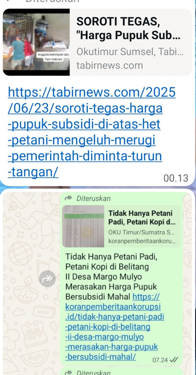 Sedangkan sudah jelas-jelas mengutip dari pemberitan media online koranpemberitaankorupsi.id dan tabirnews.com, Kios Mandiri Tani yang beralamat desa kemuning jaya kecamatan Belitang II kabupaten OKU Timur Sum-Sel di duga menjual pupuk bersubsidi melebihi dari Harga Eceran Tertinggi.di antaranya wilayah kerja desa margo mulyo pupuk jenis NPK Phonska di jual ke kelompok Margo Rejo dengan harga Rp.135.000; per sak.