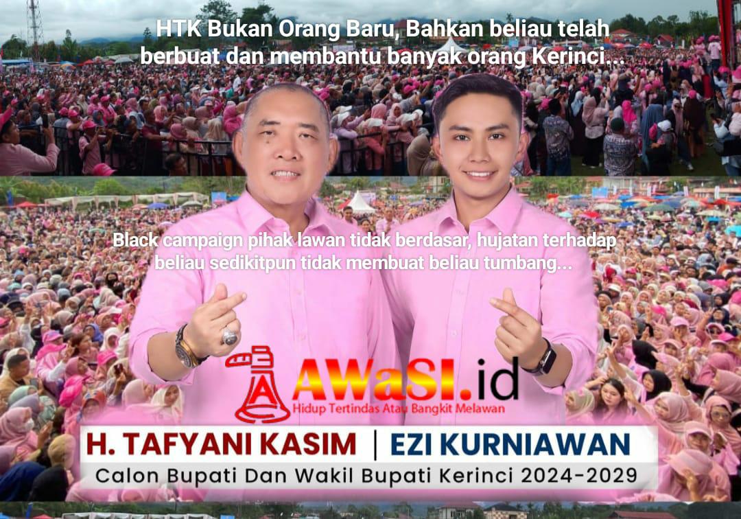 Tren positif pasangan calon Bupati Kerinci dan Wakil Bupati Kerinci, H Tafyani Kasim (HTK) – Ezi Kurniawan yang kian hari kian melejit benar-benar membuat risih segelintir pihak. Uapaya untuk menjatuhkan HTK-Ezi pun terus dilakukan.